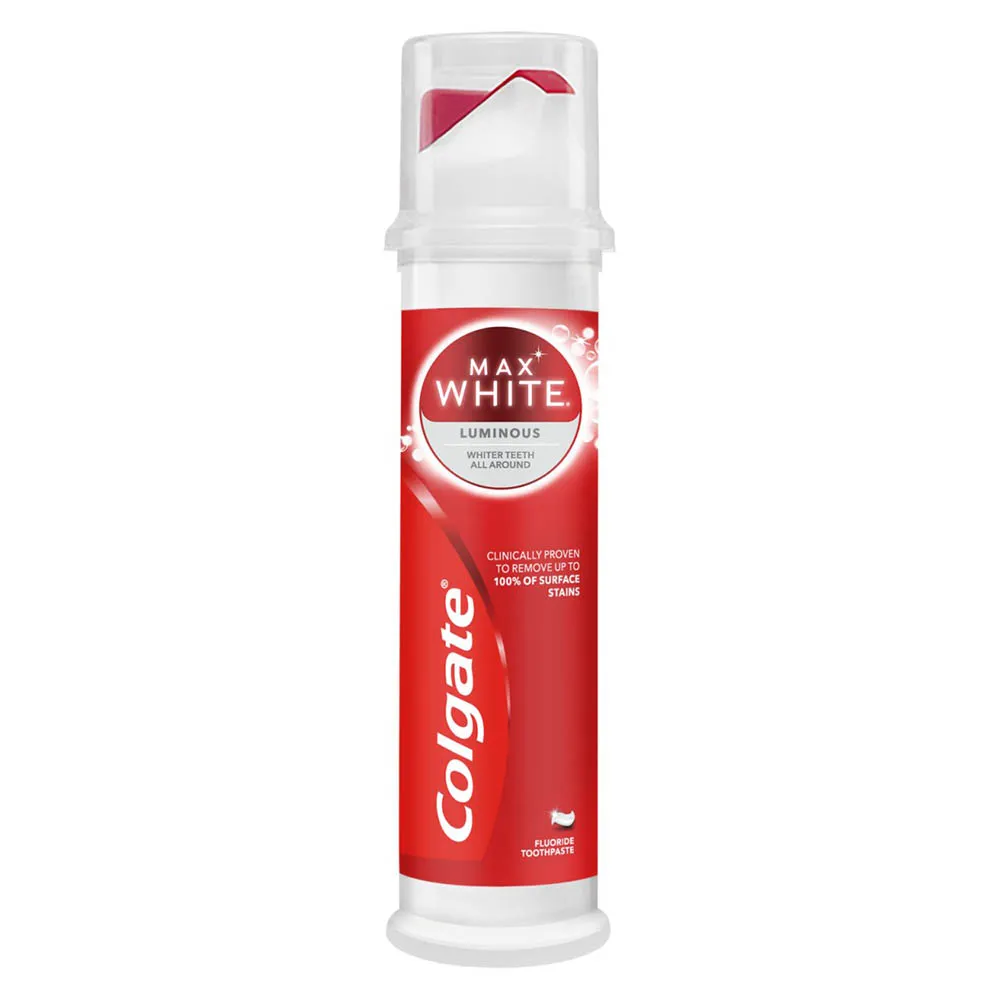 Зубная паста Colgate Max White Luminous Whitening Pump 100 мл имеет удобный дозатор, который обеспечивает точное количество пасты.